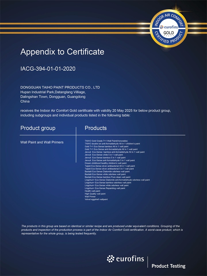 IAC-Gold(Indoor Air Comfort-Gold室內空氣質量-金級)是目前歐洲室內VOC排放最嚴格的檢測標準,由總部設立于比利時的第三方獨立檢測機構歐陸科技(Eurofin)認證。通過IAC Gold認證的產品,其生產工廠必須每年接受第三方獨立檢測機構的驗廠審核,而且室內VOC排放近零,無環境污染,不會威脅人體健康。