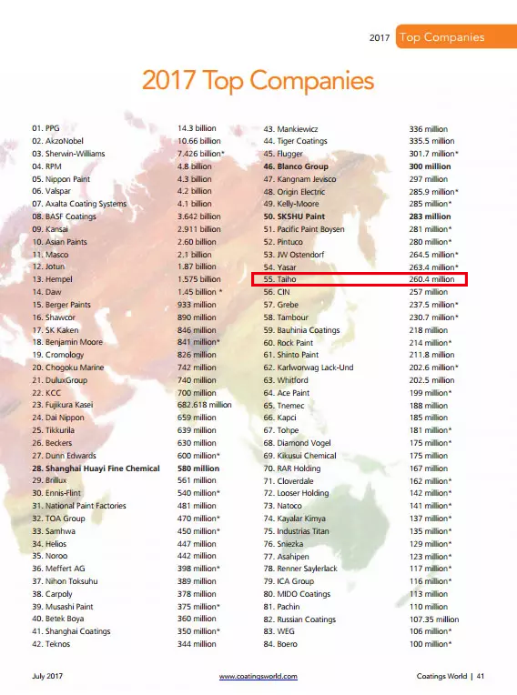 日前,美國Coatings World雜志(July 2017)最新發(fā)布2017年全球頂級涂料制造企業(yè)銷售額排行榜(前84名)(2017 Top Companies),中國5家涂料企業(yè)殺入重圍。大寶漆再次進(jìn)入該榜單,位列第55名,較上年排名前進(jìn)了三位。