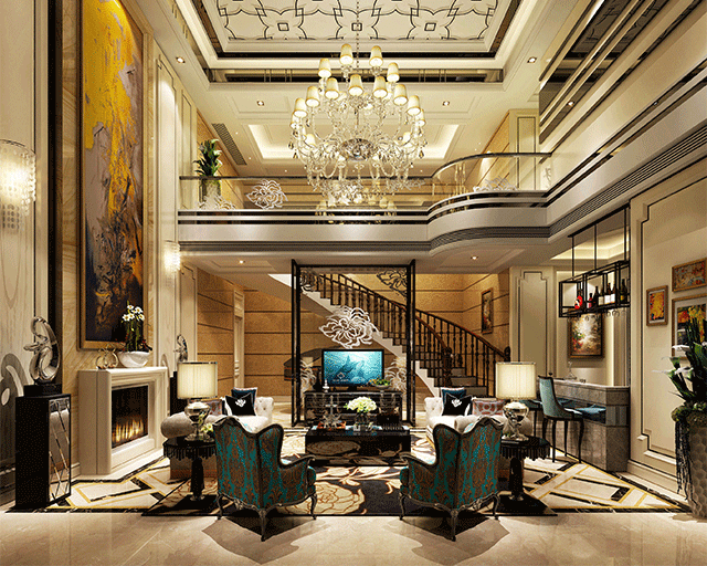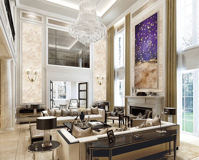 歐式客廳頂部喜用大型燈池,并用華麗的枝形吊燈營造氣氛。門窗上半部多做成圓弧形,并用帶有花紋的石膏線勾邊。室內(nèi)有真正的壁爐或假壁爐造型。墻面一般使用高檔藝術(shù)壁材,或優(yōu)質(zhì)環(huán)保的藝術(shù)涂料,如造型多樣的大寶L’opera樓貝進(jìn)口藝術(shù)涂料,來烘托豪華效果。