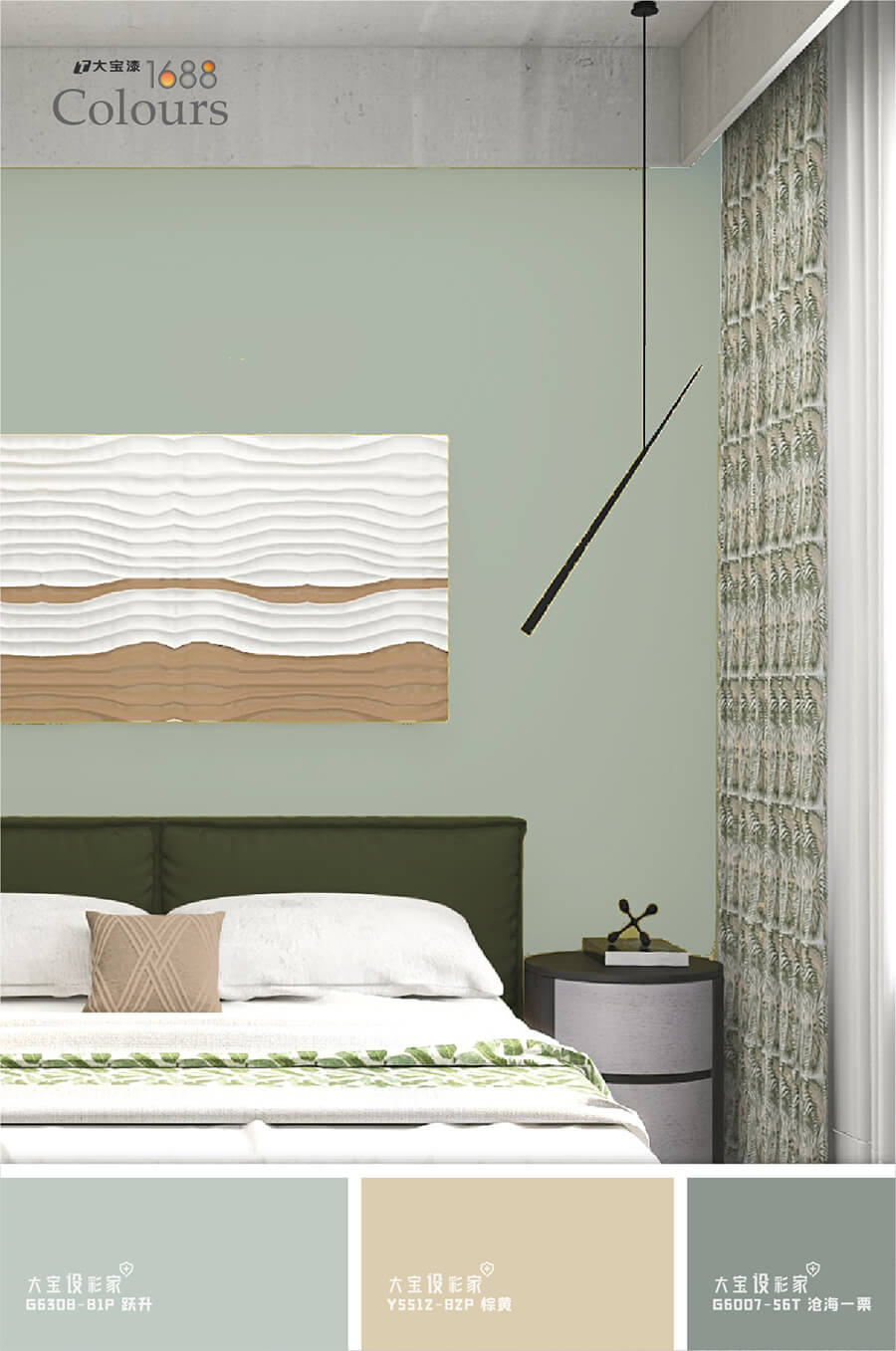 灰綠的莫蘭迪色在空間中百搭零失誤,運(yùn)用在臥室空間會(huì)更舒服穩(wěn)重,大寶荷采綠(G4940-30A)賞心悅目的顏色,富有治愈氣息,可以作為大量的墻面色彩使用,也可以用櫥柜、茶幾、床組等軟裝作為色彩載體進(jìn)行局部性點(diǎn)綴,不僅可以點(diǎn)亮空間,還能帶來(lái)清爽自由。